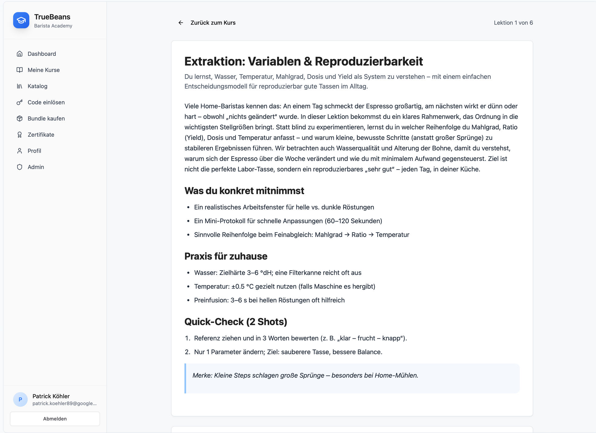Mit der Truebeans Barista Academy bekommst du ohne eine Abofalle alles, was du brauchst, um deine Kaffeemaschine wirklich zu verstehen – und jeden Tag den Kaffee deiner Träume zu brühen. Unsere praxisnahen Online-Kurse holen dich genau dort ab, wo du stehst, und begleiten dich Schritt für Schritt zu konstant hervorragenden Ergebnissen. Kein theoretisches Gerede, sondern Wissen, das du direkt anwenden kannst.
